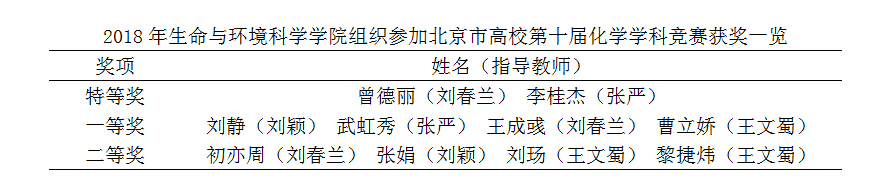 第十届北京市化学竞赛获得的佳绩体现了我校在化学专业的本科教学水平继续居北京市高校前列,有效提升了我校在本科专业教学的社会声誉。在向获奖同学表示热烈祝贺的同时,更向在培训过程中给予获奖同学以耐心指导的张严、刘春兰、刘颖和王文蜀等指导教师表示诚挚谢意!希望同学们能在这次成绩的激励下努力继续学习专业知识,培养创新思维能力,学以致用,在国家万众创新的大潮中实现人生理想。