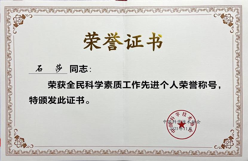 石莎教授获“全民科学素质工作先进个人”称号​
