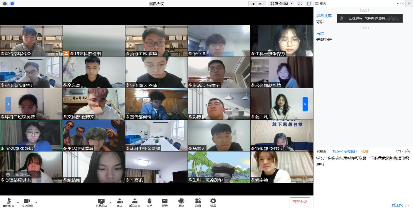 最后,由生命与环境科学学院执行主席崔扬发言。他肯定了各部门近期居家工作的成果,希望各成员做好消息的上传下达,完成好工作衔接。此外,他指出同学们居家学习可能会有所懈怠,希望同学们端正学习态度,并且各部门要发挥出引导作用以更好地帮助大家完成居家学习。