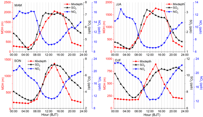 图1.不同季节上甸子大气背景站SO2和NOx浓度的平均日变化