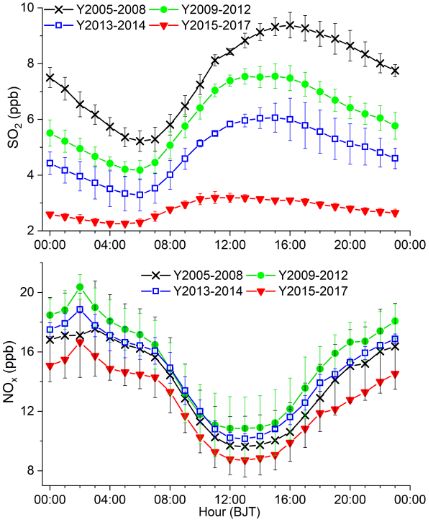 图2.不同年度区域上甸子站SO2和NOx浓度的平均日变化